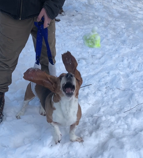 Three weeks after surgery, he could stand on his own and take a few steps. His owners support him with a sling where he throws his tennis ball up in the air and hops towards it with assistance. He is happy no matter what his circumstances are.